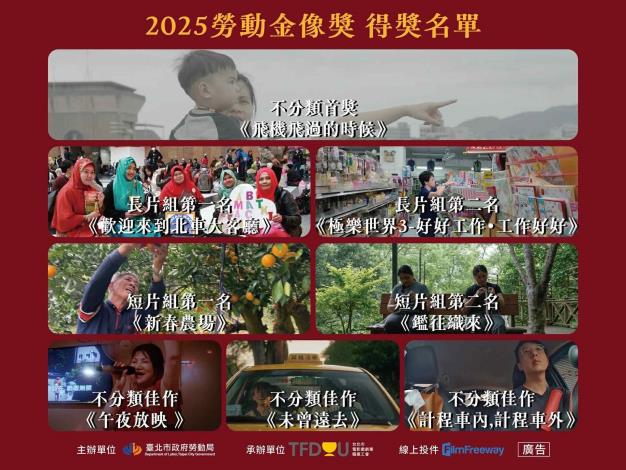 臺北市勞動局主辦的「2025勞動金像獎影片徵選競賽」於今(25)於誠品電影院舉辦頒獎典禮,勞動局王秋冬局長、評審代表鄭怡雯、韓仕賢及市政顧問等工會領袖,聯袂出席觀禮並揭曉第19屆勞動金像獎得獎名單 ...更多